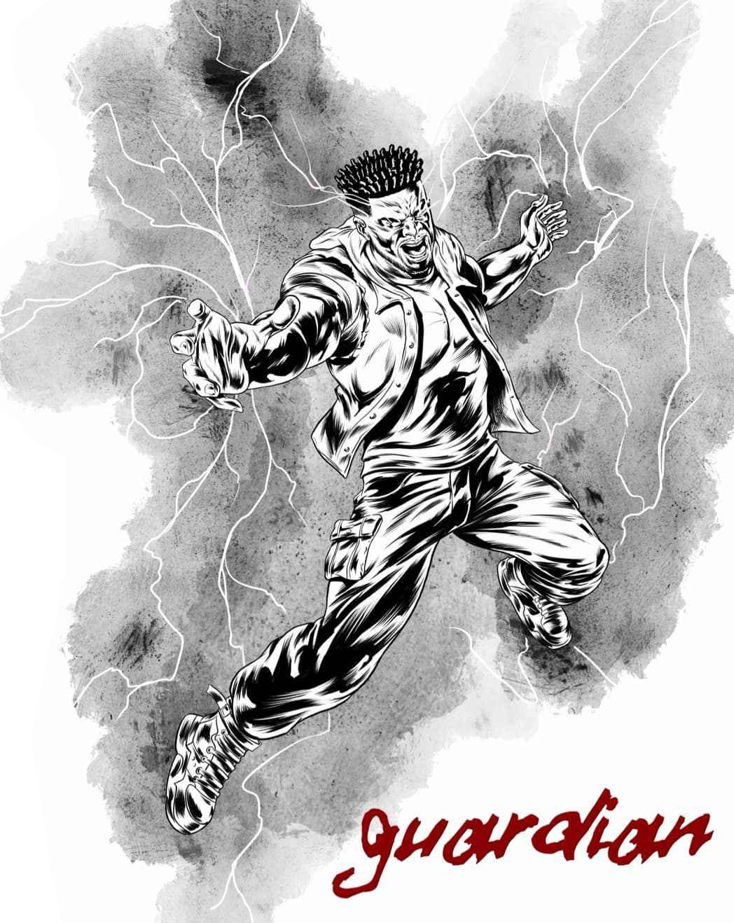 GUARDIAN, a former military combat medic, possesses various otherworldly abilities, including flight and super strength. As a veteran who has witnessed the devastating consequences of warfare, he has been observed using his healing powers far more often than his offensive ones.